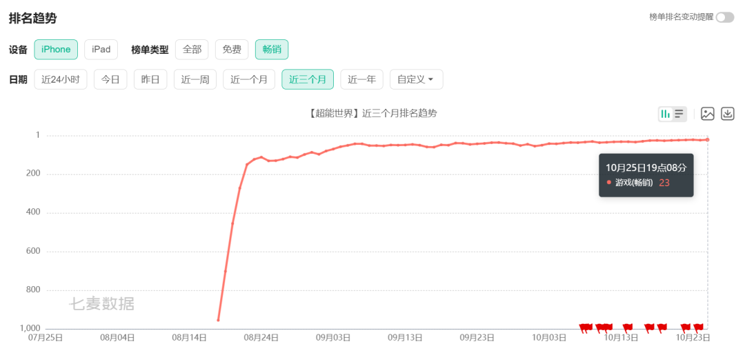 《超能世界》霸榜免费榜已经4天了,同时其目前畅销榜成绩也稳定在了20-30名左右,这是今年又一款不是头部大厂出品,没有IP加持,但上线2月成绩曲线稳步上爬的产品。