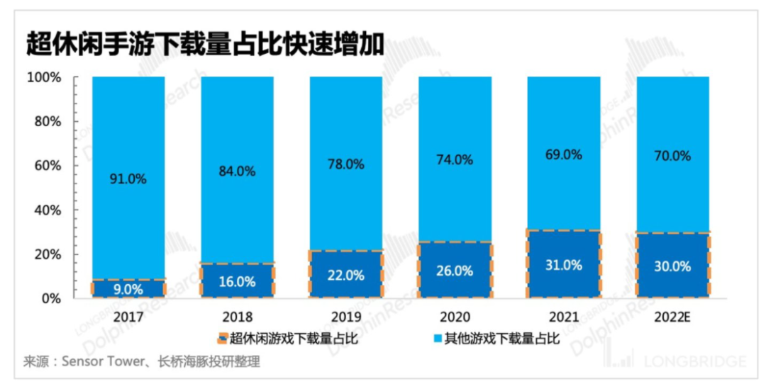调优+超休闲素材买量打法,某种程度上也算是应运而生。在近两年间,超休闲游戏是增速最快的游戏品类,其下载量比例从2017年到2022年翻了3倍不止,也拥有目前泛用户最多的流量池,且其买量成本相较于中重度游戏素材要便宜不少。