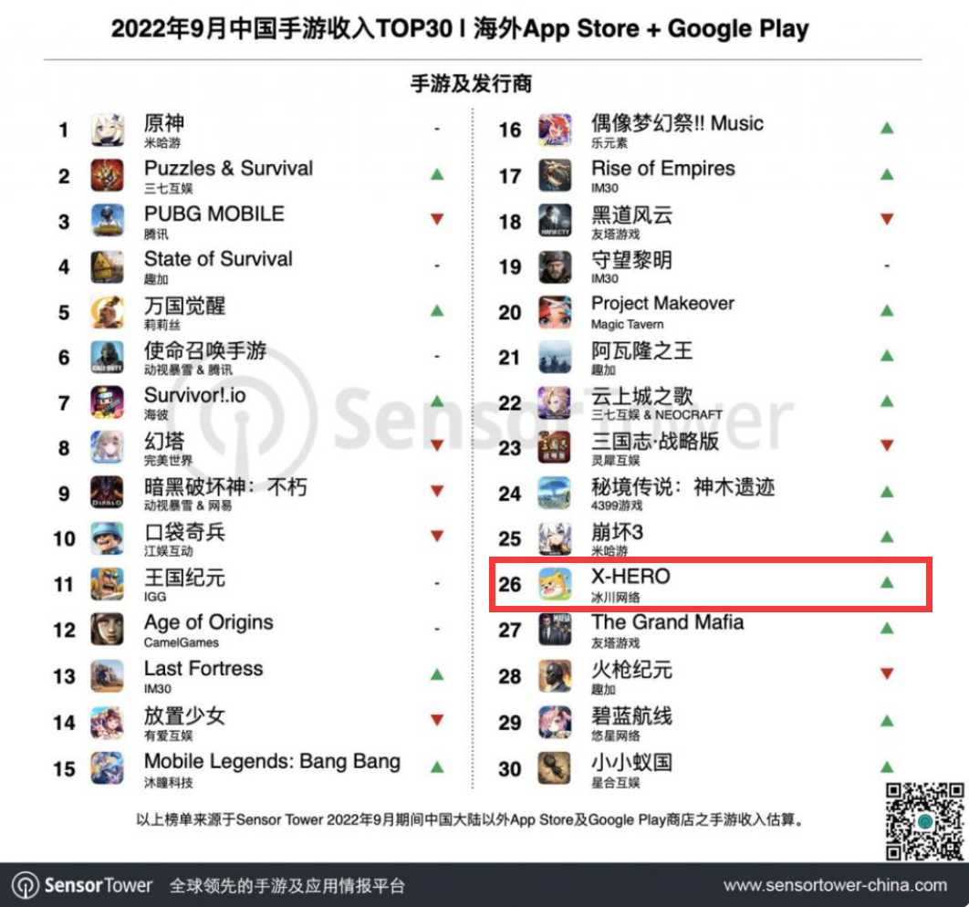 而近期打造出了《超能世界》的冰川网络,也并不是第一次尝试这种打法,旗下出海产品《X-HERO》在今年9月实现发行收入翻倍,首次入围中国手游发行商收入榜单Top30,就采用超休闲游戏素材化,获取了大量用户流量。