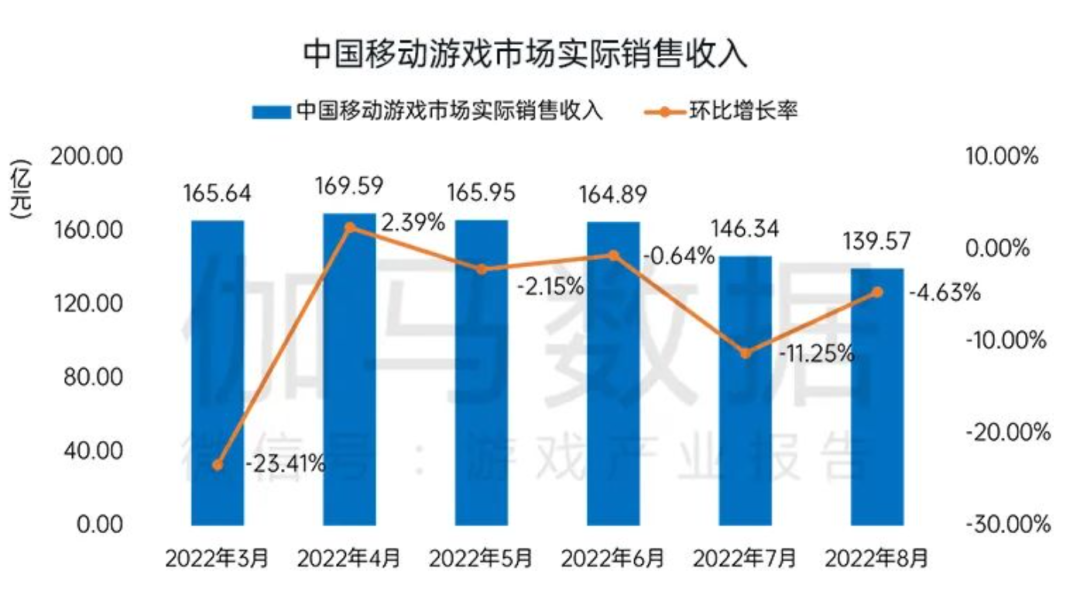 如果关注近两年游戏市场数据的朋友应该可以发现,今年国内的移动游戏市场收入,整体已经开始下行了,伽马数据发布的《2022年8月游戏产业报告》中可以看到,8月移动游戏市场实际销售收入139.57亿元,环比下降4.63%,同比下降27.45%。