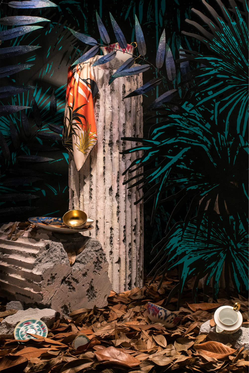 “诗意”是大多数艺术评论员形容他风格时最常用到的字眼,他本人对于此次橱窗设计最感到得益的也是“亦真亦假”的诗意感。“例如石头和树叶非常真实;反之,层叠摆放的壁板就带出属于舞台的梦境感。这些树叶在进行干燥处理后被放进橱窗,各有各的颜色,各有各的故事,很奇妙。”他提醒说:“你可以看到上海爱马仕之家的橱窗里头一次出现人形模特,在此之前通常是布景。”