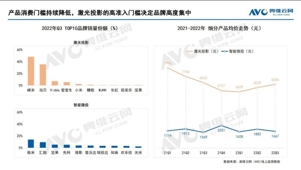 根据奥维云网(AVC)全渠道推总数据显示,2022年三季度,家用智能微投销量168.8万台,同比增长48%,销额26.4亿元,同比增长50%。