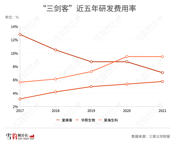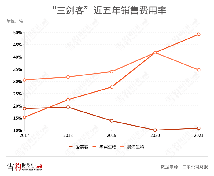近5年,华熙生物和昊海生科的销售费用率呈上升趋势,2021年销售费用占收入比重分别达到近50%和34.65%。与之形成鲜明对比的是,同一时期,两家公司的研发费用率分别为不足6%和10%,爱美客则为7%。