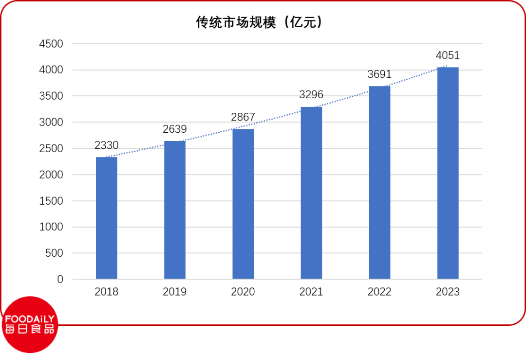 卤味市场规模较大,但较为分散,集中度不高,基于消费者如今对休闲餐饮的巨大需求,及我国冷链物流基础设施建设逐步完备,卤味市场发展迅速,潜力巨大。据美团餐饮数据观发布的《2022卤味品类发展报告》显示,2022年中国卤味行业规模将达3691亿元,预计2023年达4051亿元,2018—2021年复合增长率为12.3%。