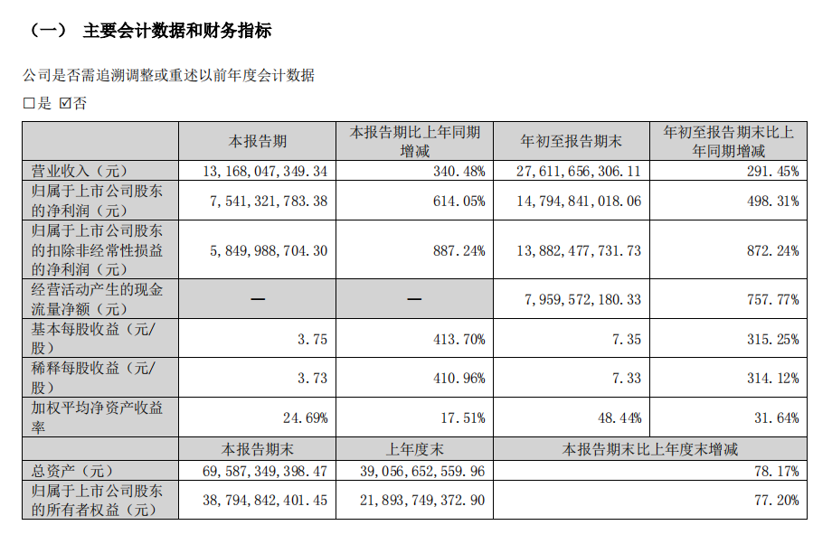 今年前三季度,赣锋锂业实现营收276.12亿元,同比增长291.45%;归属于上市公司股东的净利润为147.95亿元,同比增长498.31%。归属于上市公司股东扣除非经常性损益的净利润为138.82亿元,同比增长872.24%。