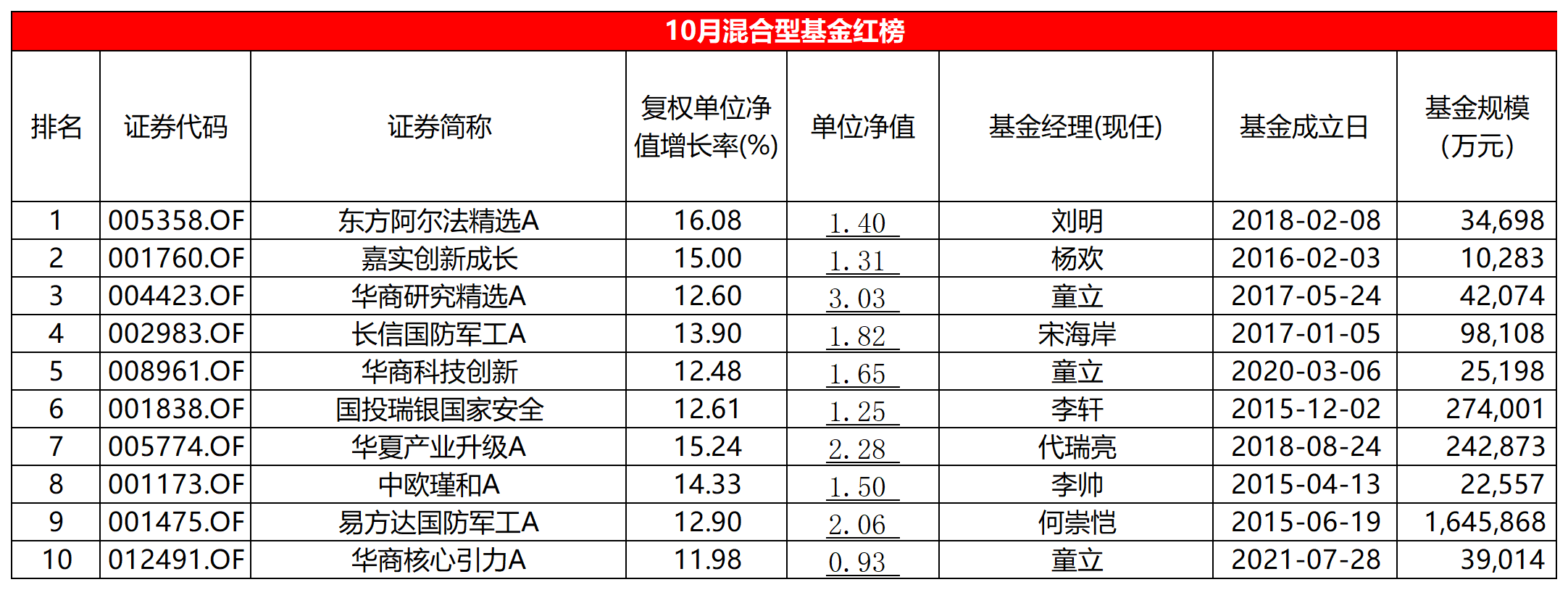 排在红榜第一位的是东方阿尔法精选,10月份的涨幅为16.08%。该基金成立于2018年2月8日,成立至今回报率为39.61%。截至三季度末,基金规模为4.05亿元。该基金持仓集中度较高,前十大重仓股合计占比高达82.03%。从三季报来看,基金新增了多只国防军工板块个股,也因此10月份净值涨幅较大。