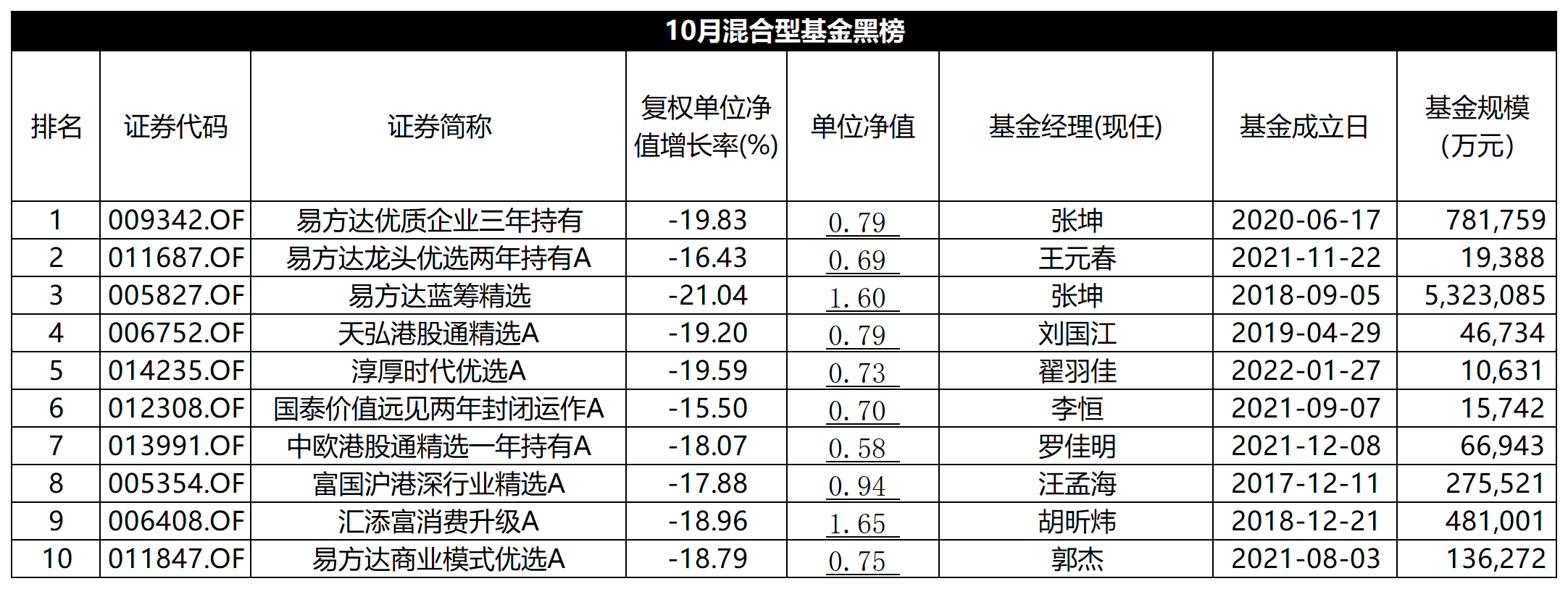 以下为得分最低的十只基金明细: