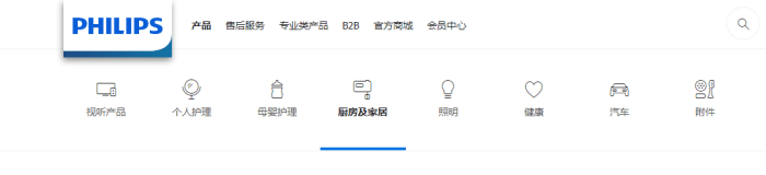 在飞利浦首页官方产品页面,“视听产品”、“个人护理”、“厨房及家居”这三个类目中,仍然罗列着最“全”的飞利浦家电品类相关业务。其中,“视听产品”包括电视、显示器、投影仪、音箱、手机与平板电脑等产品;“个人护理”涵盖剃须刀、理发器、电动牙刷、冲牙器、美容仪、脱毛仪等产品;“厨房及家居”则主要包括空气净化器、加湿器、空调、吸尘器、挂烫机、咖啡机、空气炸锅、电饭煲、净水/热水解决方案、智能门锁等产品。