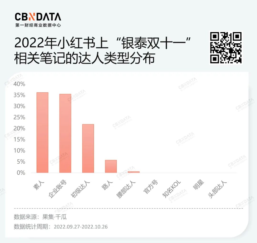 与电商渠道的流量转化极度依赖头部达人、KOL不同,线下渠道的流量更多依赖所在城市、社区的居民。以银泰为例,根据果集·千瓜数据,关于“银泰双十一”的种草笔记中,来自素人、企业账号、初级达人、路人的笔记数量占据了绝大多数。除了商场和品牌的企业号,自发的路人和素人成为银泰双11线上流量的主要来源。