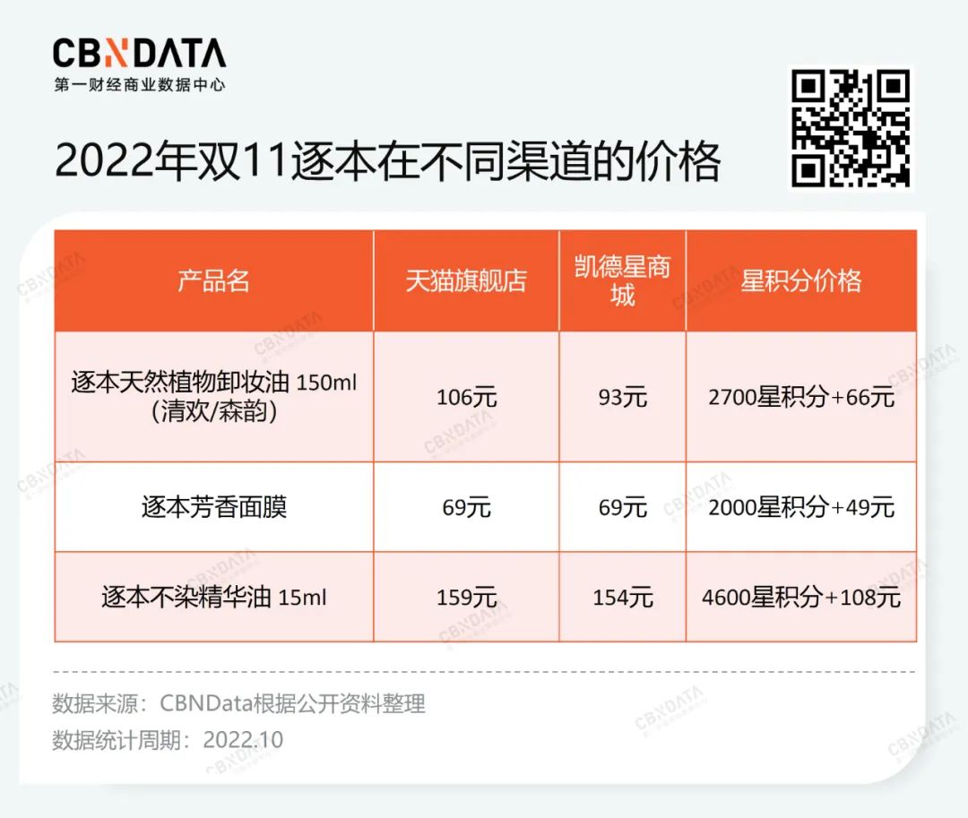 从价格来看,逐本为了入驻凯德星商城,也拿出了足够的诚意。双11期间,逐本不少系列产品在凯德星上与天猫旗舰店同价,甚至更低。如果以凯德星积分来抵扣,基本可以达到全网最低。以逐本明星单品植物卸妆油(清欢/森韵)为例,双11凯德星商城价格93元/瓶,比天猫旗舰店低12.3%,星积分后价格仅66元/瓶,甚至低于天猫双11预售首日李佳琦直播间的到手价88元/瓶。