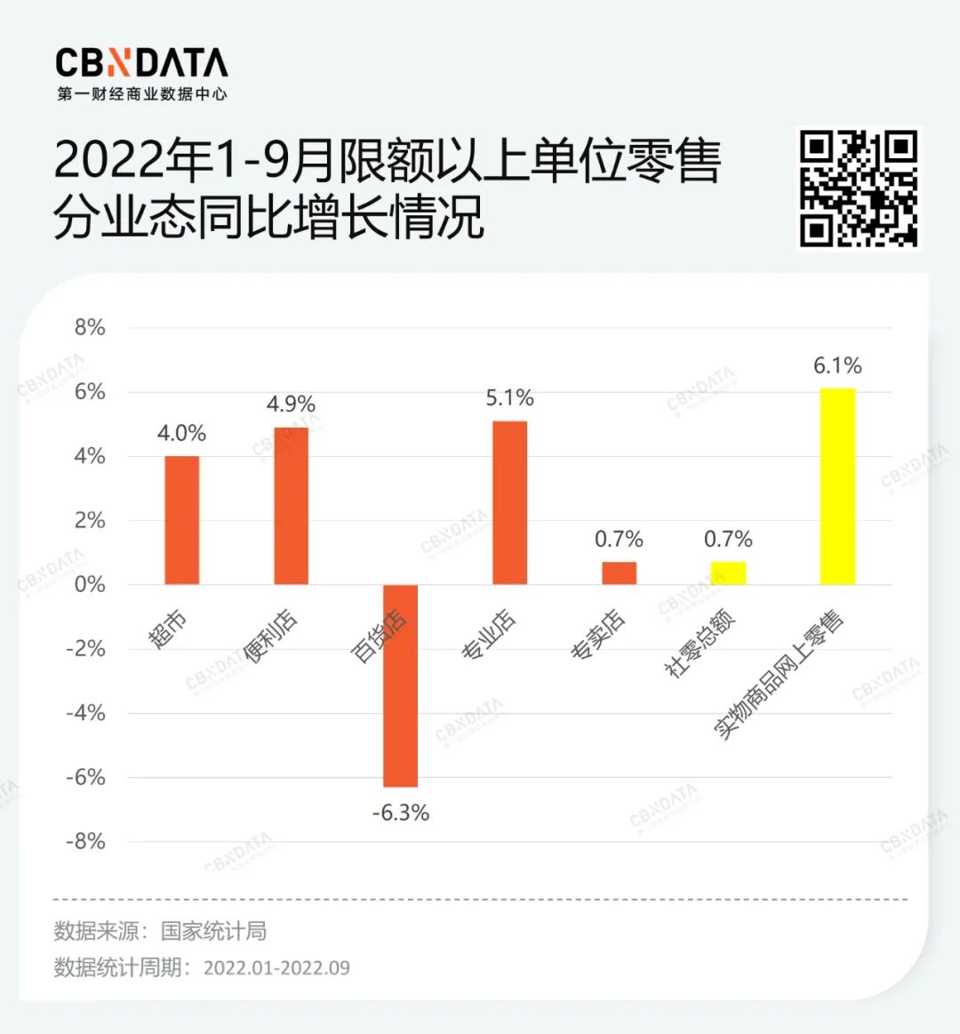 这与近年来百货业增速疲软和2020年后疫情反复对百货业的冲击密切相关。国家统计局数据显示,今年1-9月,各大线下业态的零售额增速均低于网上零售增速,其中以百货店最明显,同比去年下滑了6.3%。一度高企的空置率也让线下百货们选择线上线下双管齐下,一方面通过“线下自提”服务吸引客流,一方面也为入驻商家带来更多销售渠道。