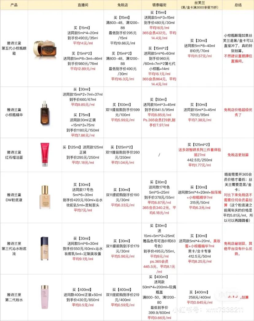 在小红书上,不少博主双11预售之前就开始做攻略,将明星产品在线下商场、免税店与李佳琦直播间预售首日的价格进行对比,进而得出“最低价”。以线上线下争夺最为激烈的美妆品类为例,小红书用户“沐沐口红修复”在对比各渠道价格(含赠品)后得出:免税店的雅诗兰黛小棕瓶精华价格最低、海蓝之谜浓缩精华和兰蔻菁纯面霜在银泰喵街最划算……不少博主在比价后感慨“比佳琦直播间还便宜”“直播间剁手先缓缓”。