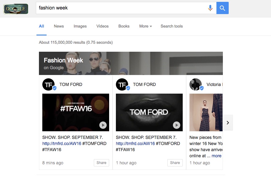 时值四大时装周即将在本月陆续开幕之际,Google宣布其搜索功能将进一步对时装周内容进行优化,推出名为“Fashion Week on Google”的新项目。通过它,使用者在Google的网页、智能手机端输入涉及时装周的关键词后,可获取相关品牌、设计师的最新时装系列资讯,甚至购买新产品。而该项目的发布,也预示着Google从搜索引擎到整合媒体平台的野心。