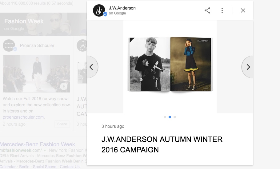 据悉,现阶段的“Fashion Week on Google”将着重于2017纽约春夏女装周。当使用者在Google首页搜索“Fashion Week”或相关设计师、品牌名称等关键词后,网站会在显著位置提供包括秀场、后台、前排嘉宾、秀后派对,潮流分析等最新图片信息。设计师、品牌亦可使用“Google Posts”(别名“Google Podium”,尚在测试期,受邀注册后方可开启账户)发布内容。目前,开通“Fashion Week on Google”的品牌包括Prada、Marc Jacobs、J.W.Anderson、Jason Wu、Gucci、Tom Ford、Victoria Beckham、Rodarte、Opening Ceremony、Proenza Schouler,Burberry等。此外,像Burberry、Tom Ford这些宣布在新系列中采用即秀即买模式的品牌,用户也可通过“Fashion Week on Google”中的链接做到即时购买。基本上,“Fashion Week on Google”是一个以优化关键词搜索结果,扩大用户动机的内嵌式社交媒体平台。