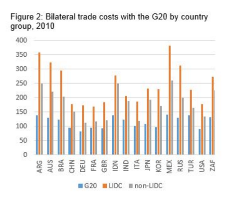 对于发展中国家在世界贸易中所面临的问题,去年10月世界银行的报告指出,低收入发展中国家(LIDC)的进出口额只占全球贸易的3%到4%。报告还称,G20经济体是低收入发展中国家的主要贸易伙伴——LIDC约有70%的进口来自G20经济体;80%的出口输往G20,但LIDC与G20经济体之间的贸易成本比G20成员之间的成本高出很多。