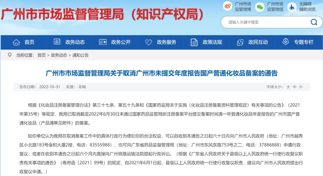 根据广州市监局发布的“关于取消广州市未提交年度报告国产普通化妆品备案的通告”显示,由于截至2022年6月30日未通过国家药品监管局新注册备案平台提交备案时间满一年普通化妆品年度报告,广州市监局已取消一批广州市国产普通化妆品的备案,涉及17万+个产品。