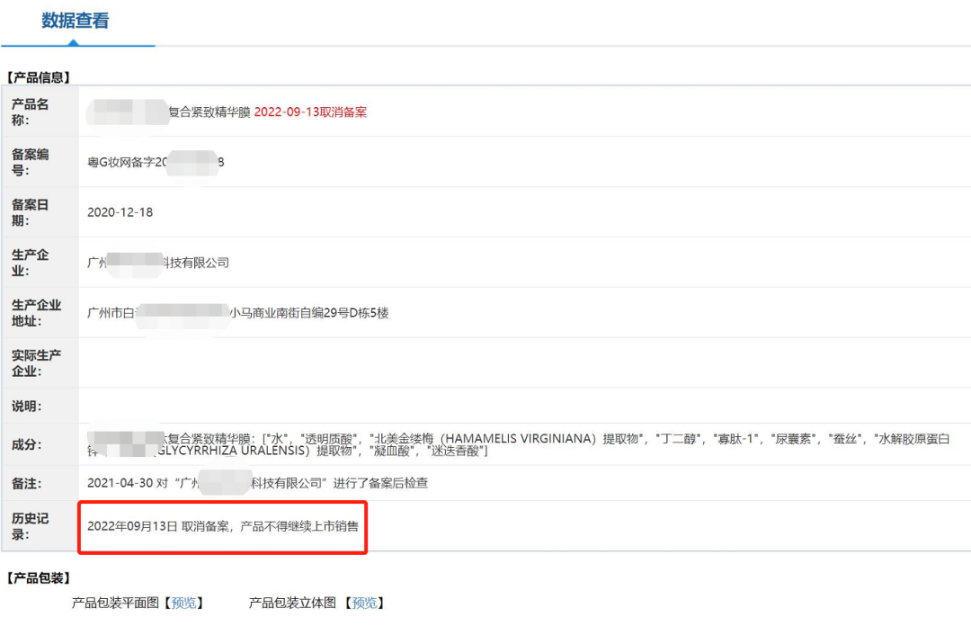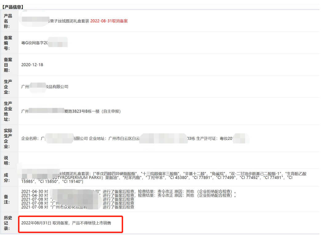 青眼在上述列表中,随机选取了多款产品在国家药监局普通化妆品备案平台进行查询显示,其产品备案信息均已显示“取消备案,产品不得继续上市销售”。