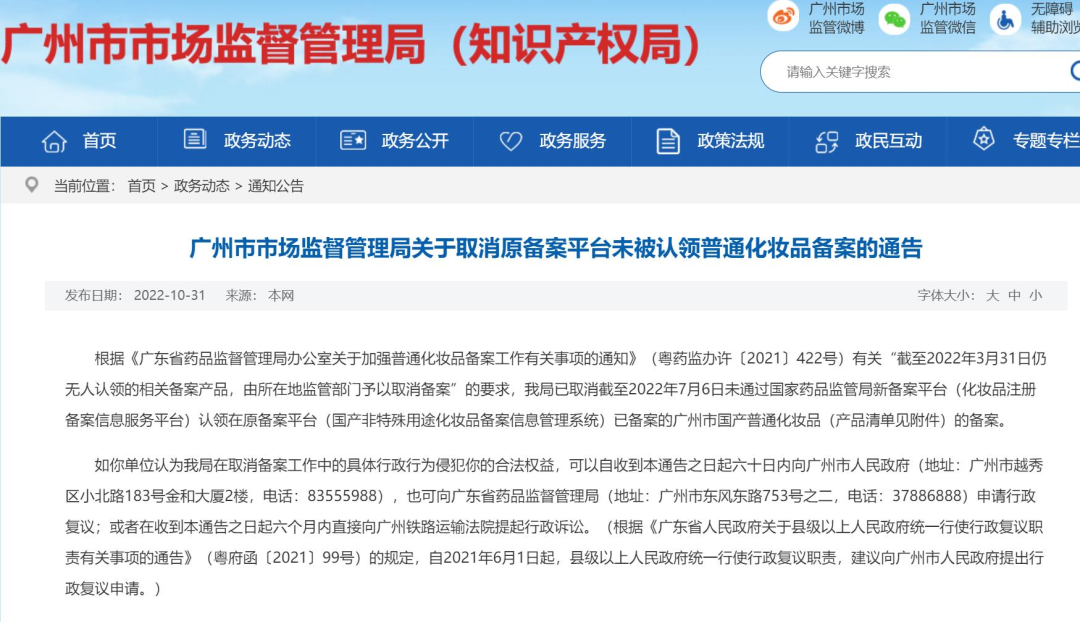 根据广州市监局另一份“关于取消原备案平台未被认领普通化妆品备案的通告”,截至2022年7月6日未通过国家药品监管局新备案平台(化妆品注册备案信息服务平台)认领在原备案平台(国产非特殊用途化妆品备案信息管理系统)已备案的广州市国产普通化妆品,也被取消备案,涉及产品约为5.9万+个。