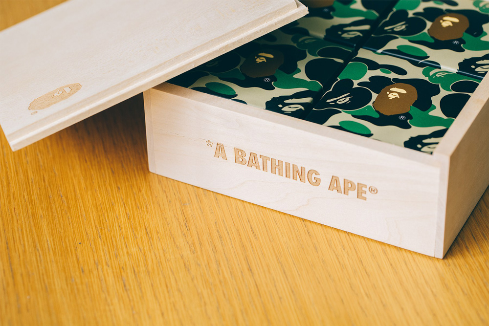 A BATHING APE®在日本本部的另一基地香港,每逢中国传统节日都会推出特别单品。今年的中秋节,A BATHING APE®和更年轻化的副线AAPE BY A BATHING APE®分别推出了特别款月饼。A BATHING APE®用精致的木盒盛放四个以迷彩图案包装的月饼,而AAPE BY A BATHING APE®则是把迷彩图案直接用于整个外盒包装。