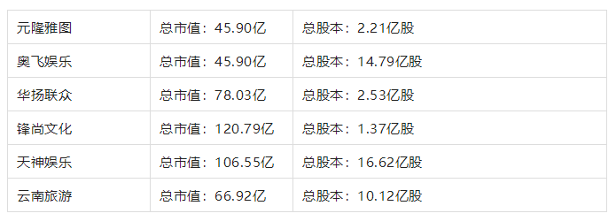 元隆雅图总市值:45.90亿总股本:2.21亿股奥飞娱乐总市值:45.90亿总股本:14.79亿股华扬联众总市值:78.03亿总股本:2.53亿股锋尚文化总市值:120.79亿总股本:1.37亿股天神娱乐总市值:106.55亿总股本:16.62亿股云南旅游总市值:66.92亿总股本:10.12亿股
