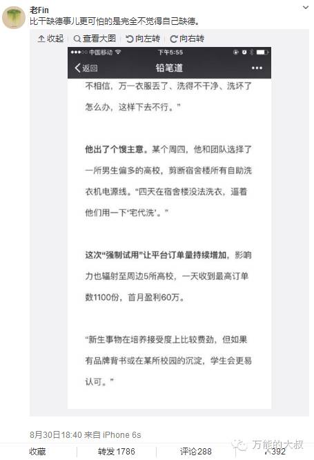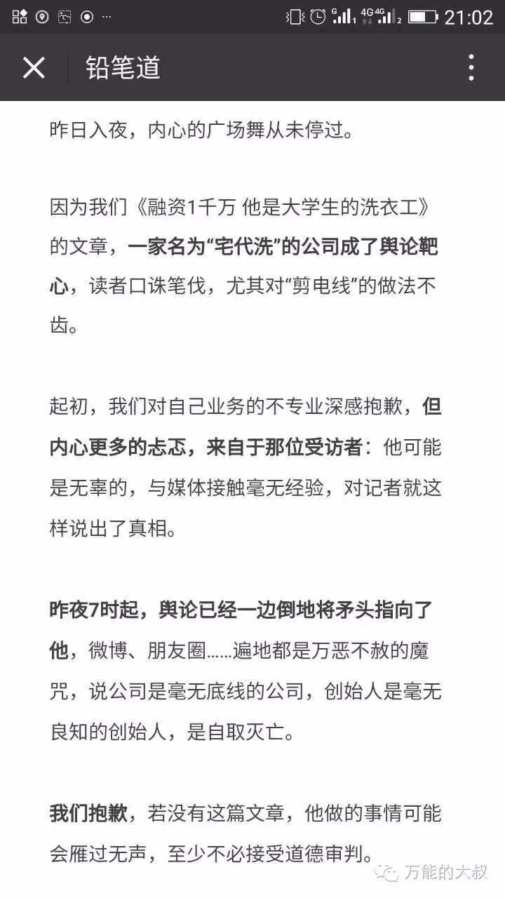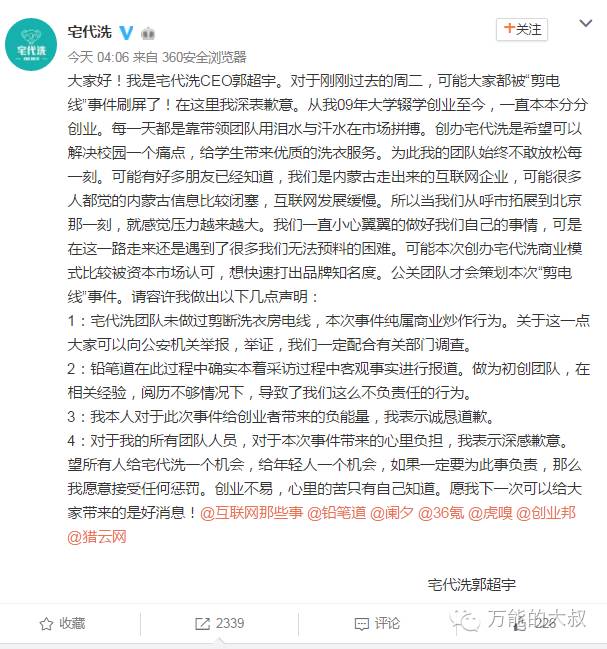 大叔简单说一下事情的经过:昨天,号称创业者融资首发阵地的自媒体“铅笔道”头条发布了一篇题为《融资1千万 他是大学生的洗衣工 14道工序洗净99%衣物 覆盖1500所高校》的文章。文中介绍,“宅代洗”创始人郭超宇在进入校园洗涤市场时,为了推广自己的接单平台,把一所高校自动洗衣机的电源线剪短了,“四天在宿舍楼没法洗衣,逼着他们用一下‘宅代洗’。”