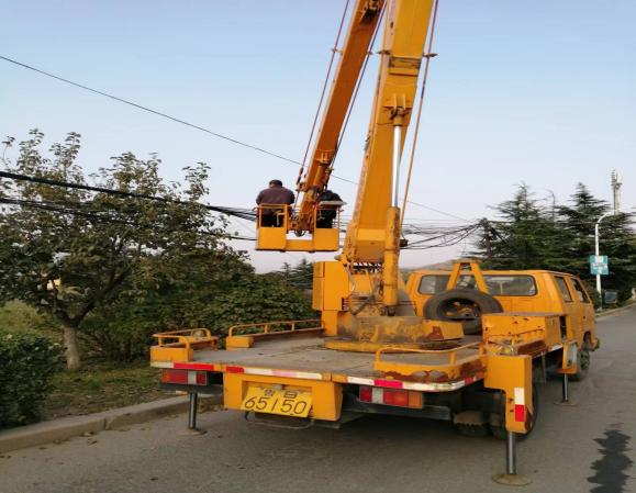 在海尔路西侧的海尔工业园附近,高空施工作业车展开悬臂,工作人员正在剪除废弃缆线。据了解,此处位置缆线杂乱,长期弃置不用,部分通信缆线缠绕在线杆之上,严重影响市容环境。为彻底解决好此处问题,崂山区空中缆线整治工作领导小组办公室组织各通信公司、供电中心和公安部门多次现场协调,全面细致排查周边地下管道现状情况,按照“能入地皆入地”的原则,引导各单位有序将缆线下地。对于杂乱无用的通信缆线,各通信公司确权后,市政专业工作人员统一清除,剪断空中布设的钢线及光缆。缆线清除后,区供电中心进一步组织施工,将弃置线杆全部拔出,彻底消除问题隐患,此处整治清理缆线1000米,拔除线杆8座,净化了城市空间环境。