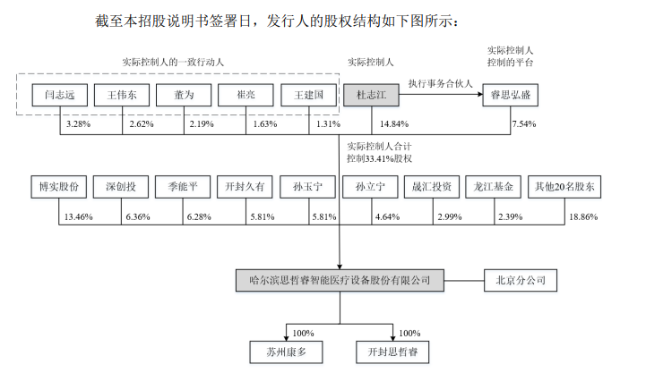 IPO前,杜志江直接持有公司 14.84%股份;并通过其一致行动人以及睿思弘盛执行事务合伙人控制公司,合计控制思哲睿33.41%股权。