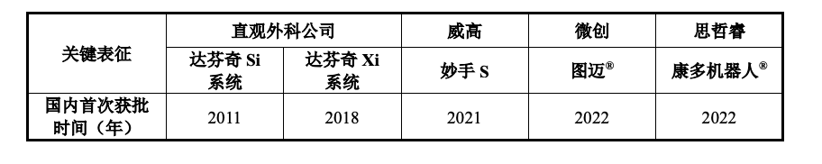 2021年,威高的妙手S系统于获国家药监局批准上市,打破了达芬奇手术机器人在国内这一领域长达十余年的垄断;2022年2月,微创机器人的图迈腔镜手术机器人于获国家药监局批准上市;2022年6月,康多腔镜手术机器人,通过了国家药监局审批获得第三类医疗器械注册证。
