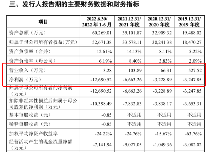 报告期内,公司的营收分别为527.52万元、66.31万元、103.89万元、3.28万元;归属于母公司股东的净利润分别为-3247.85万元、-3228.89万元、-6663.26 万元和-12690.52万元。