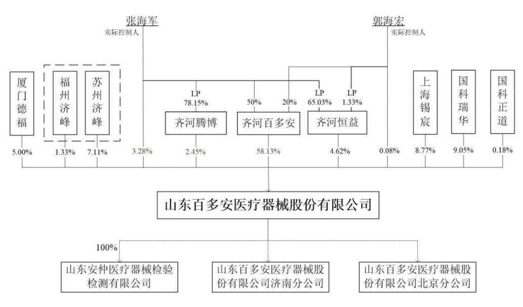 截至报告期末,张海军、郭海宏夫妇二人通过持有齐河百多安70.00%股权间接控股山东百多安58.13%的股份。同时,两人还分别持有公司员工持股平台齐河恒益和齐河腾博78.15%、66.36%的股份。