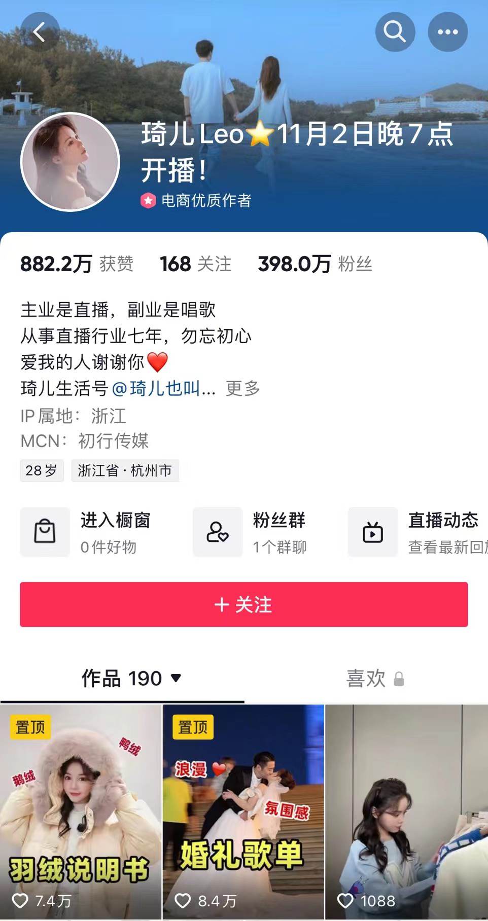 薇娅的前助播“琦儿Leo”,也在今年5月开启个人抖音直播带货,当晚GMV达到2600万元,截至目前,积累了近400万粉丝。
