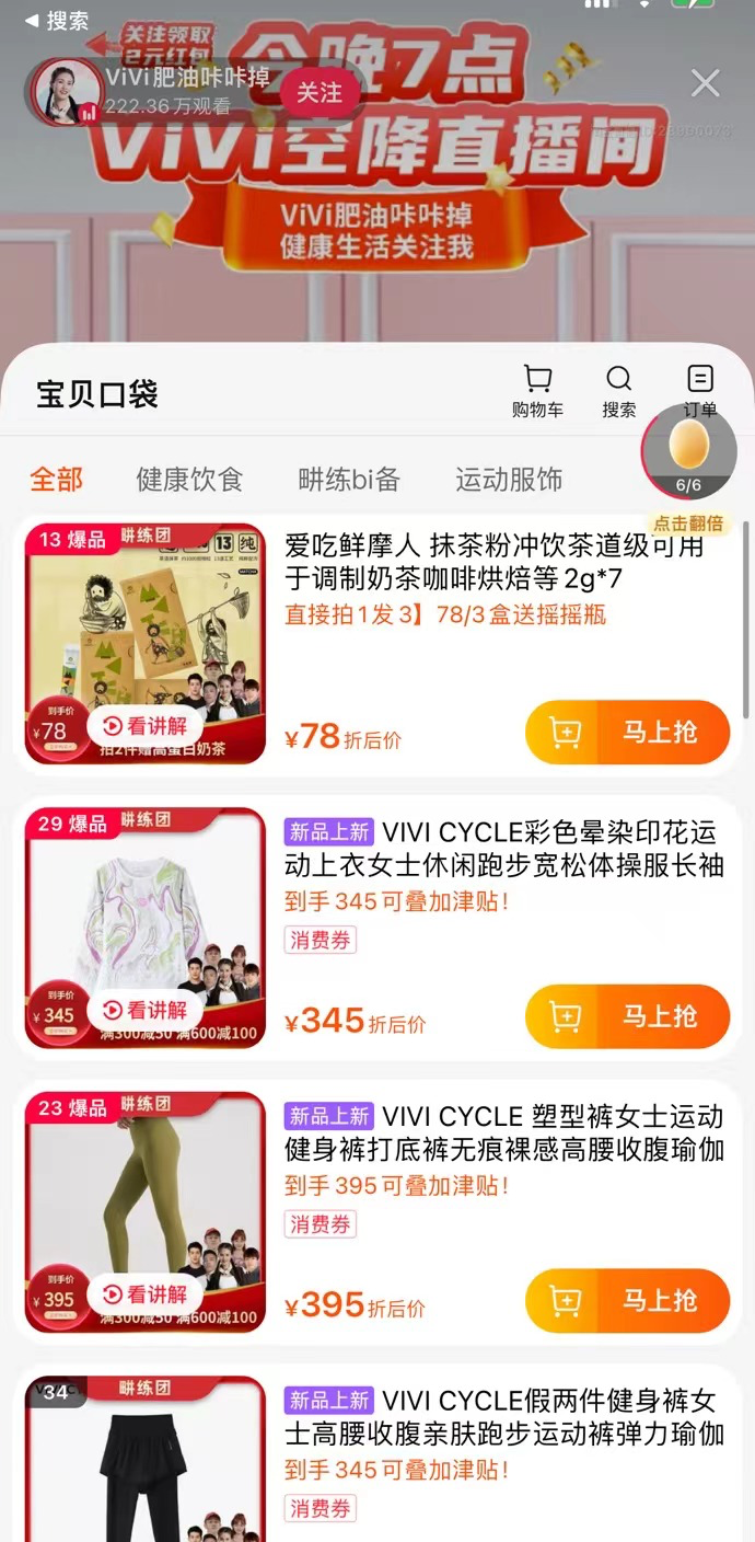 刘畊宏老婆ViVi的淘宝直播间则跟抖音完全不同,相较于抖音直播的疯狂暴汗,淘宝直播间“ViVi肥油咔咔掉”则以刘畊宏夫妇自创的品牌为主场。整场直播只有34多个货品,以饮食、运动服饰和运动装备为主。直播间的“VIVI CYCLE”、“耕练”“爱吃鲜摩人”“魔胴”等多个品牌都是刘畊宏旗下公司注册的商标。