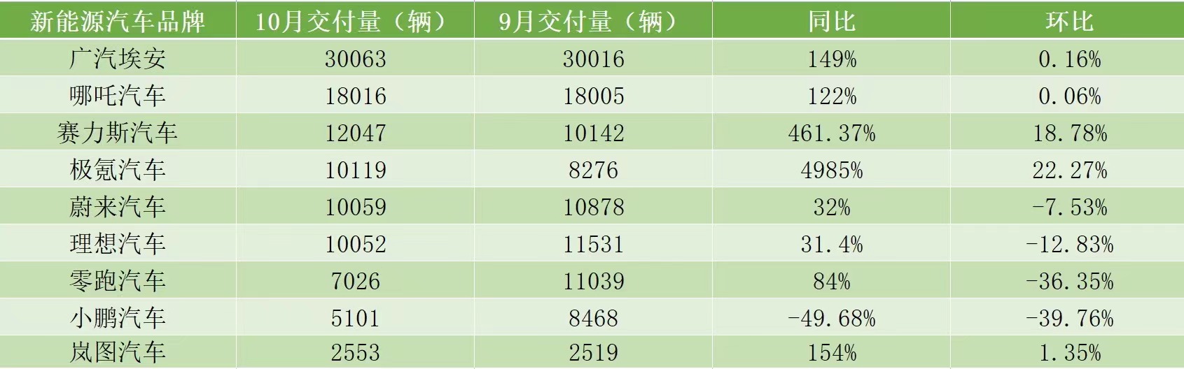 同样陷入增长瓶颈的还有哪吒汽车,10月“哪吒U+V”交付18016辆,仅比9月多交付了11辆。截至10月,哪吒已经累计交付12.9万辆新车,同比增长161%,稳居新势力品牌第一阵营。