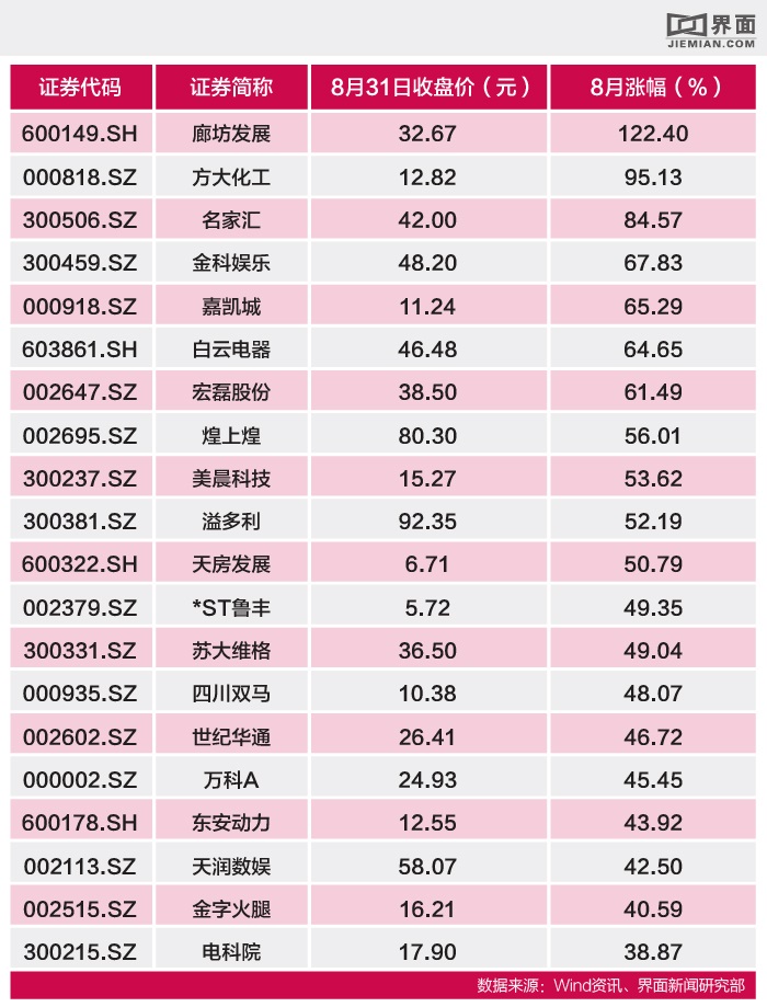 当然,有涨就有跌。相较于廊坊发展、方大化工(000818.SZ)这些动辄就要翻倍的个股,以欣泰电气(300372.SZ)、国旅联合(600358.SH)为首的个股股价则在8月份受挫。