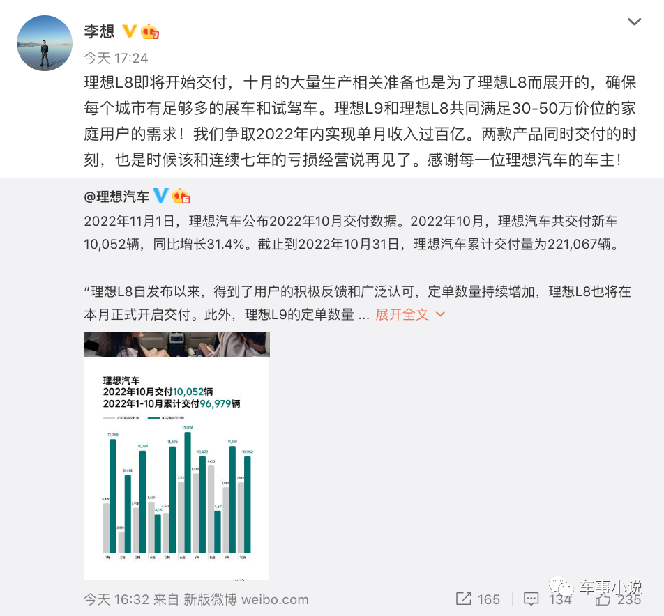 对此,李想11月1日自己在社交平台称,十月的大量生产相关准备是为了理想L8而展开的。据其表示:”争取2022年内实现单月收入过百亿。两款产品同时交付的时刻,也是时候该和连续七年的亏损经营说再见了”。