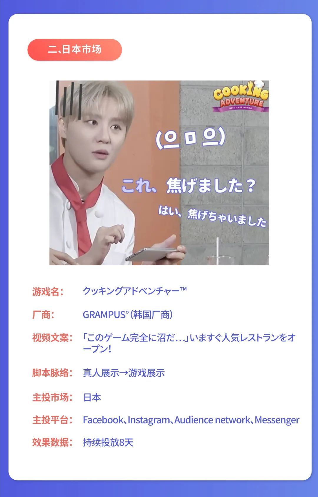 场景方面配合厨房、他身着的厨师服等都贴合了游戏的厨房场景。随后出现的Q版游戏风格也符合日本玩家的审美。且整个视频非常简短,真人和游戏素材比例、以及总时长都拿捏到位。然而,素材总体较短,会让玩家觉得“没看够、莫名其妙”的感觉。