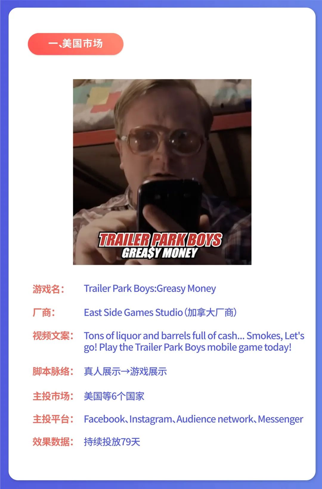 ②创意分析:模拟一个朴素真实的场景,看似玩家在过往真实经历场景中玩游戏,是令受众感到舒适、放松的。在本素材中,游戏内容高度还原《Trailer Park Boys》中故事情节、玩法,让受众的记忆系统在进行回忆时重新构建,通过情怀唤醒,让受众感受到情怀与压力的双重释放。《Trailer Park Boys》是一部电视喜剧系列片,采用的都是“仿纪录片”的拍摄手法,假装有一个团队跟在主角旁边跟踪拍摄。从此真人素材的选角来看,与剧中人物高度相似,能很快让人联想到剧中的场景人物,针对性较强,但可能没有帅哥美女更具吸睛点。从场景来看,美式复古、千禧年风、类胶片像素风格,均贴合了美国玩家的“写实、还原”口味。