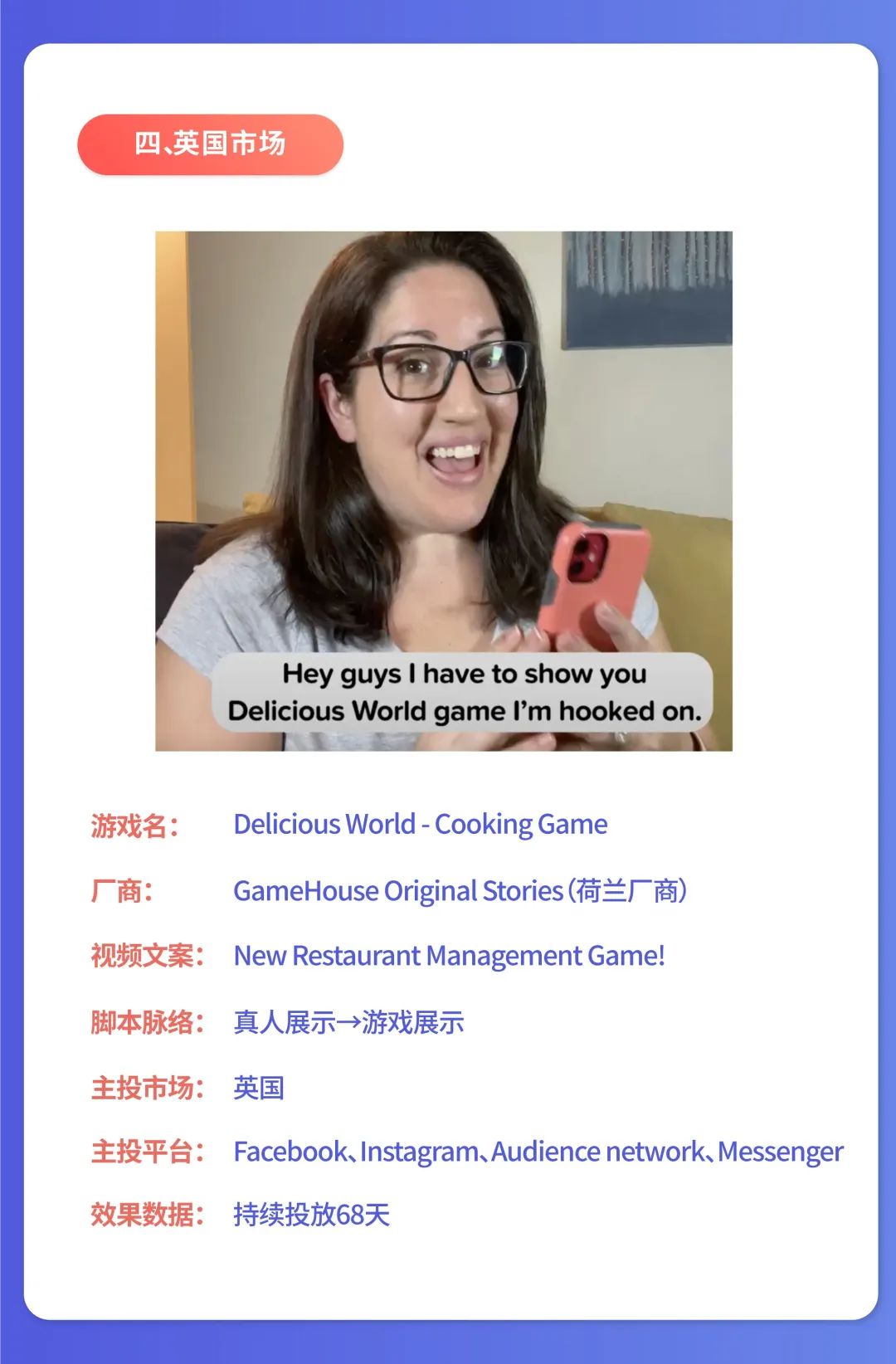 英国人说话比较婉转,所以从选角来看,用的是有亲和力的“邻居”人设,展示英式礼貌、英式客套。素材中的真人语言为鼓励、激励性用语,没有过多的套路,使用轻松的英式交流方式迎合英国玩家的社交习惯和交流方式,从而达到影响和号召玩家去玩玩的的目的。