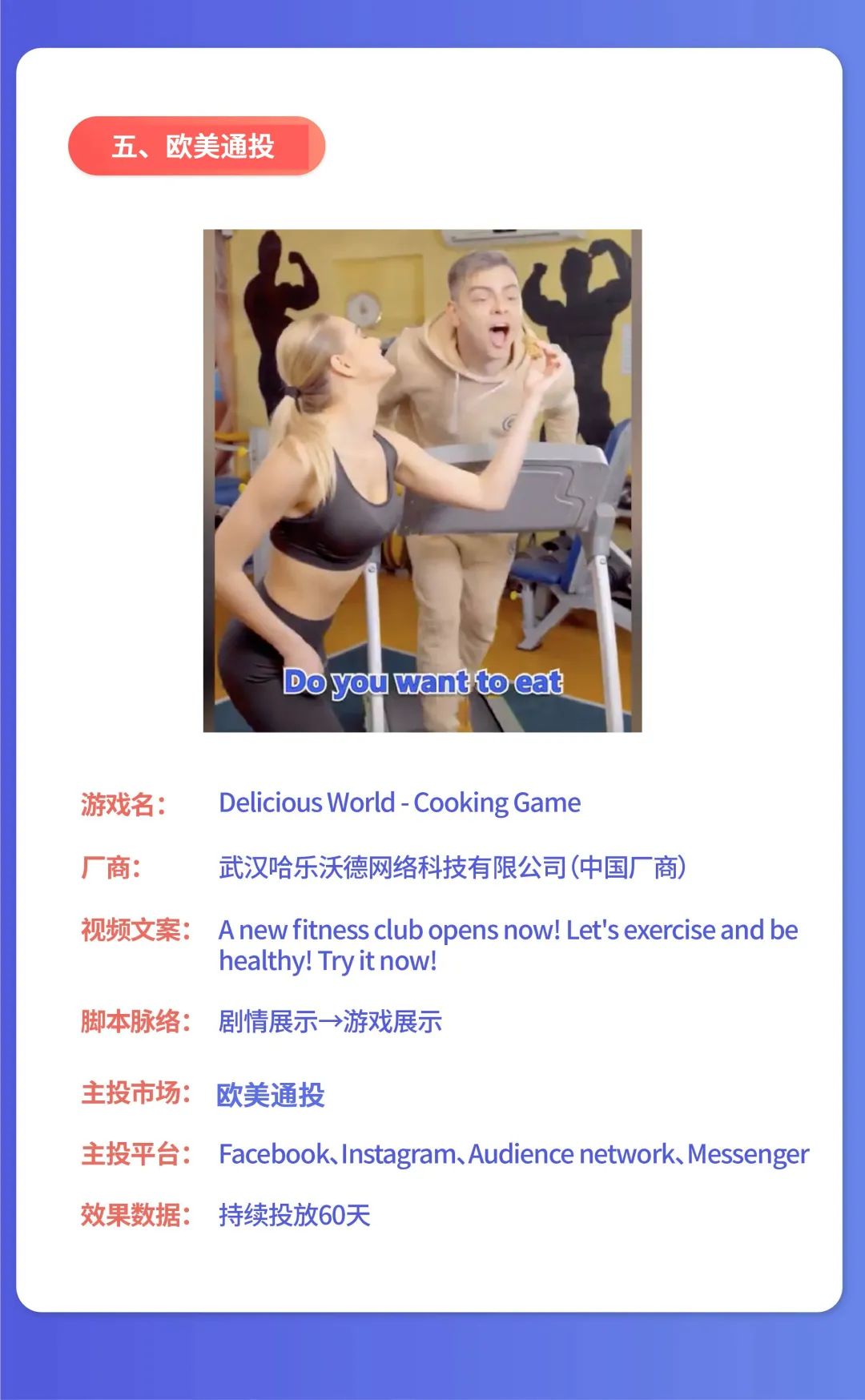 使用了美女帅哥作为长期兴趣吸睛点,健身房场景也与游戏场景相一致。而坐在跑步机上边喝可乐边走步的反差真人创意内容,紧紧贴合了欧洲地区人对于讽刺类搞笑素材的偏好。