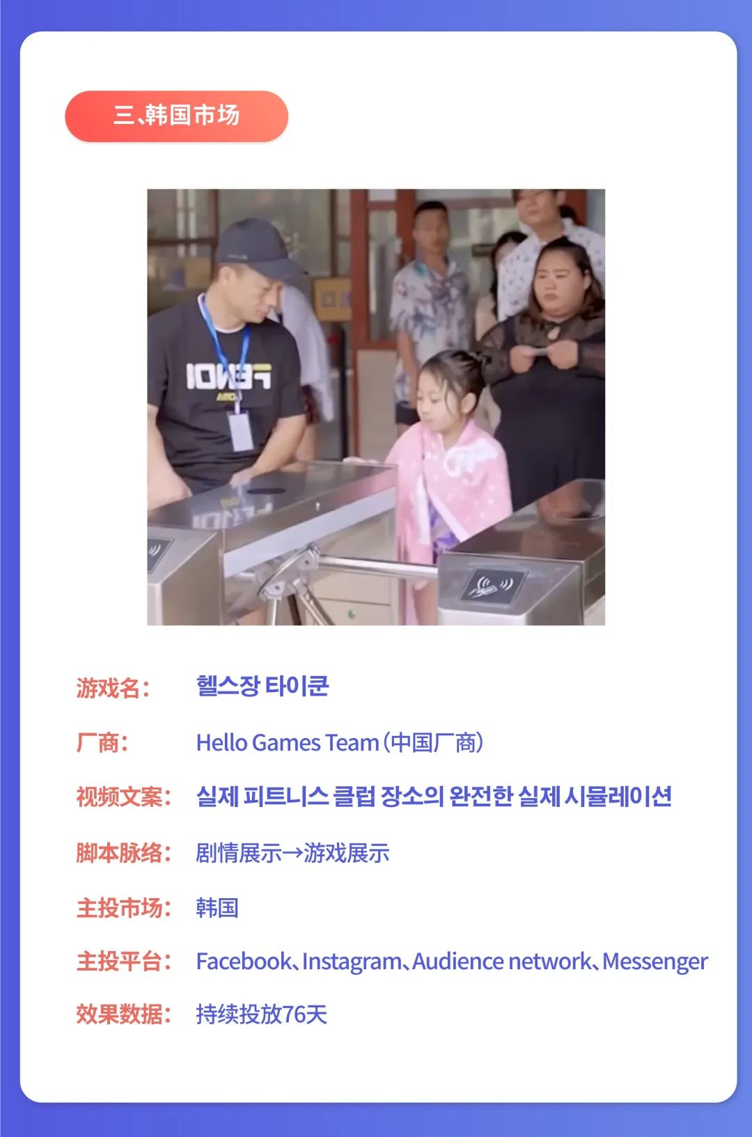 转化点:真人素材结束后的游戏画面,为胖子在健身房运动,但后续出现了胖子乏力、放弃运动去吃东西的状况,并配上“我需要教练的帮助”字幕,让玩家产生“我要帮助他成功减肥”的助人心理。(好奇尝试)