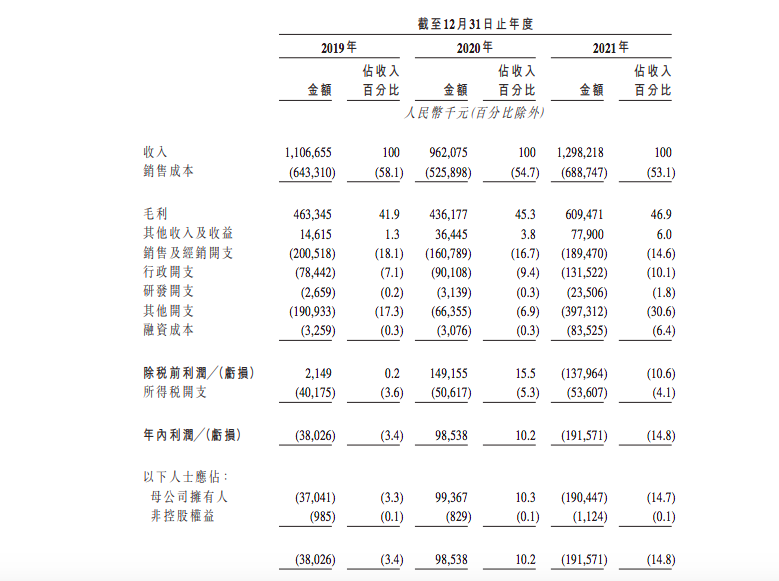在二次更新的招股书中,高视医疗2021年营业收入有了一定增长,由2020年9.6亿元增加至2021年12.9亿元,涨幅达到34.38%。然而意外的是,2021年公司年内利润却并未延续2020年的增长势头,反而亏损额度达到1.92亿元。
