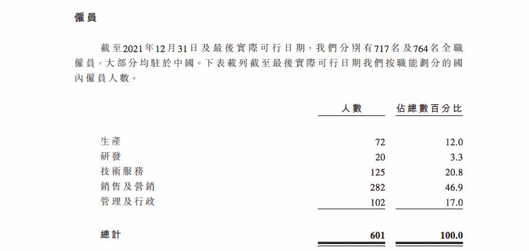对于2021年研发费用“大幅”增长,高视医疗表示主要乃由于完成收购泰靓及罗兰后,公司原有的研发团队规模扩展。然而事实胜于雄辩,高视医疗截至最后实际可行日期拥有764名全职雇员,其中研发人员仅20人,占比3.3%,甚至不及最大比例的销售及营销人员(占比46.9%)的一个零头。据业内人士分析,2021年研发费用之所以有相对较大的增长幅度,也与其IPO需要“讲好资本故事”不无关联。高视医疗仅是为了“试图让投资者相信,公司还是重视研发的。”