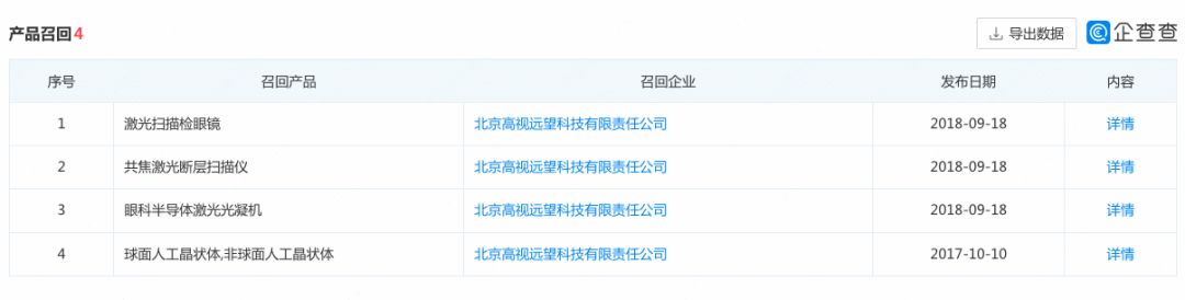 在游走于上游供应商和下游经销商之间,高视医疗的日子并不好过,经营发展中面临着重重风险。据企查查信息显示,2017-2018短短两年时间内,高视医疗旗下北京高视远望科技有限责任公司就曾经发生过四例产品召回事件,被召回产品包括球面人工晶状体、非球面人工晶状体、眼科半导体激光光凝机、共焦激光断层扫描仪、激光扫描检眼镜等。