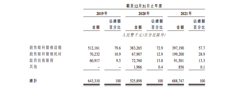 除了过分依赖对外收购提升销售收入,高视医疗还有一个更加严重的营收比例失衡问题,那就是超七成收入来源为经销产品。招股书显示,高视医疗的销售收入整个分为三大类,分别是销售产品(包括眼科医疗设备及耗材)、技术服务以及其他。2019-2021年,公司销售产品带来的收入占比达到90.1%、85%和86.9%,占比有轻微波动,但这部分仍然是公司核心业务领域。