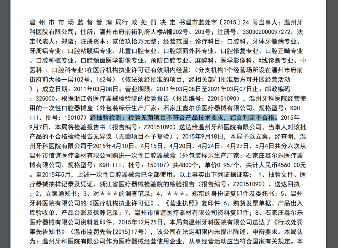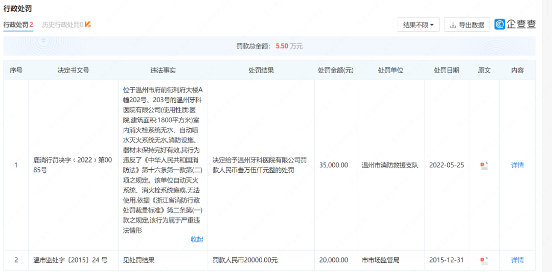 企查查显示,美皓医疗旗下的温州牙科医院有限公司曾多次被罚。2022年5月25日,在冲刺上市期间,该公司因消火栓系统瘫痪无法使用,被温州市消防救援支队处罚3.5万元。2015年底,还因经营使用的一次性口腔器械盒检验无菌项目不符合产品技术要求,被判定不合格,被温州市市场监管局罚款2万元。