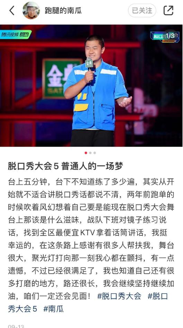 今年 7 月,南瓜和奥运冠军徐梦桃、喜剧演员宋小宝、网红理发师@山城小栗旬 等上了笑果的综艺《怎么办!脱口秀专场》的「欢迎光临」专场,一句“外卖员说最美的不是下雨天是道德制高点下的屋檐”将南瓜的表演送上了热搜,也将他送进了《脱口秀大会》第五季的初赛。