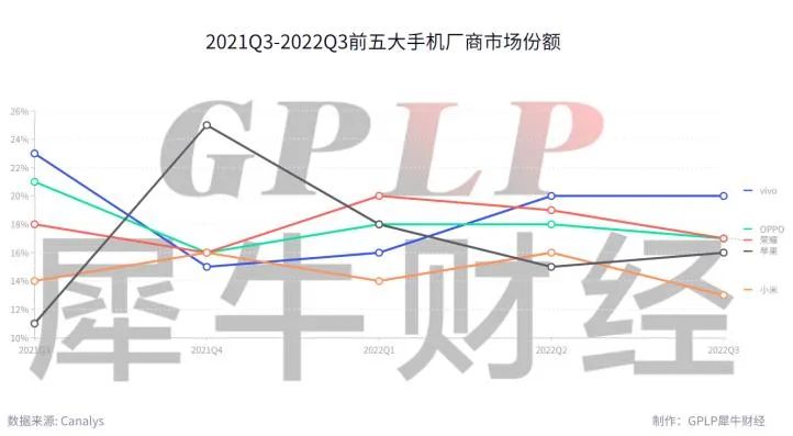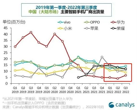 另据Canalys数据显示,国产厂商在国内出货量也都有一定程度下滑,据其报告显示,第三季度,vivo手机出货量为1410万台,同比降23%;OPPO手机出货量为1210万台,同比降27%;荣耀手机出货量为1200万台,同比降16%;小米手机出货量为900万部,同比降17%。