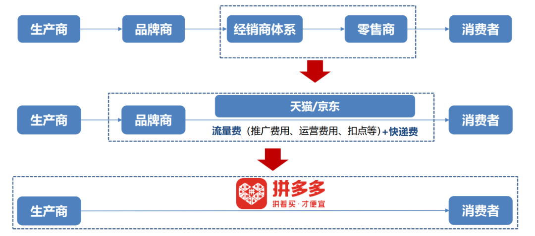 电商本质是流量的生意,流量的获取和分配方式格外重要,平台自身流量成本低,才能将流量赋能或让利更多给用户或商家,提高平台冷启动的速度。阿里之所以屏蔽微信,原因就是要把流量分配权握在自己手里。不过拼多多的出现,打破了阿里的构想。