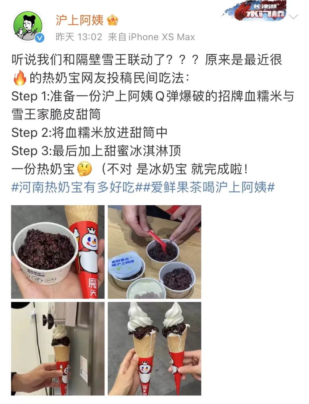 沪上阿姨在官方微博回应“与雪王联动热奶宝”,也给了我一个灵感: