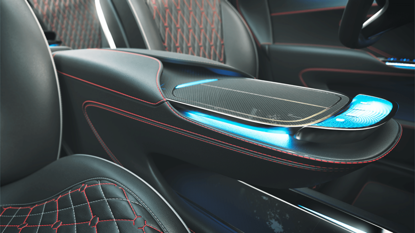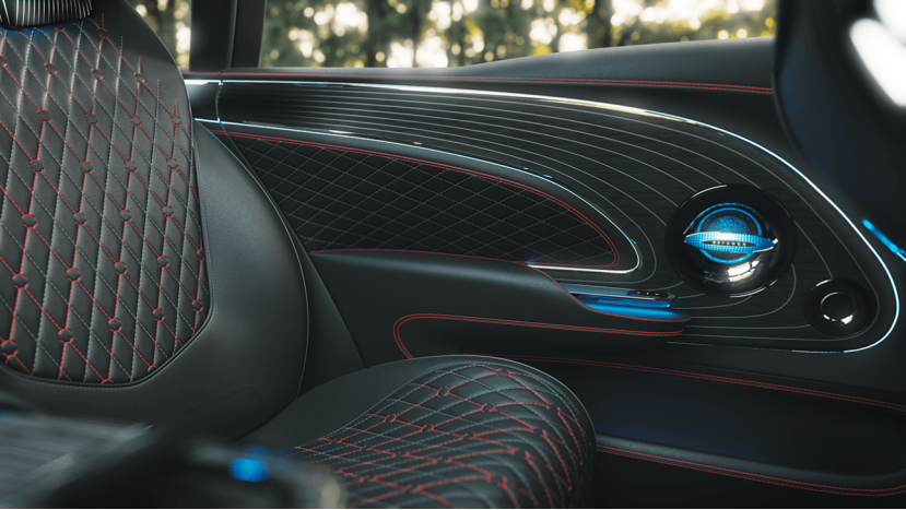 新车内饰在方向盘、音响发声单元、换挡按钮等多个地方均加入了带有菱形格栅造型的氛围灯。